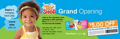 Sears Toy Shop is having their grand opening on October 16 from 11am until 1 pm! The first 50 families will get a FREE $5 Sears gift card! There will also be cupcakes, face painting and other goodies!